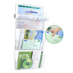 Panel s tromi odkladačmi na triedenie pošty pre dokumenty formátov do 24 × 32 cm s možnosťou zavesenia odkladačov spolu alebo každého separátne. Postranný „U“ rez udrží obálky A3+. Materiál nárazuvzdorný recyklovaný polystyrén. Rozmery jedného odkladača (š × v × h) 361 × 270 × 86 mm. Dodávané vrátane montážnych skrutiek. Farba číra.